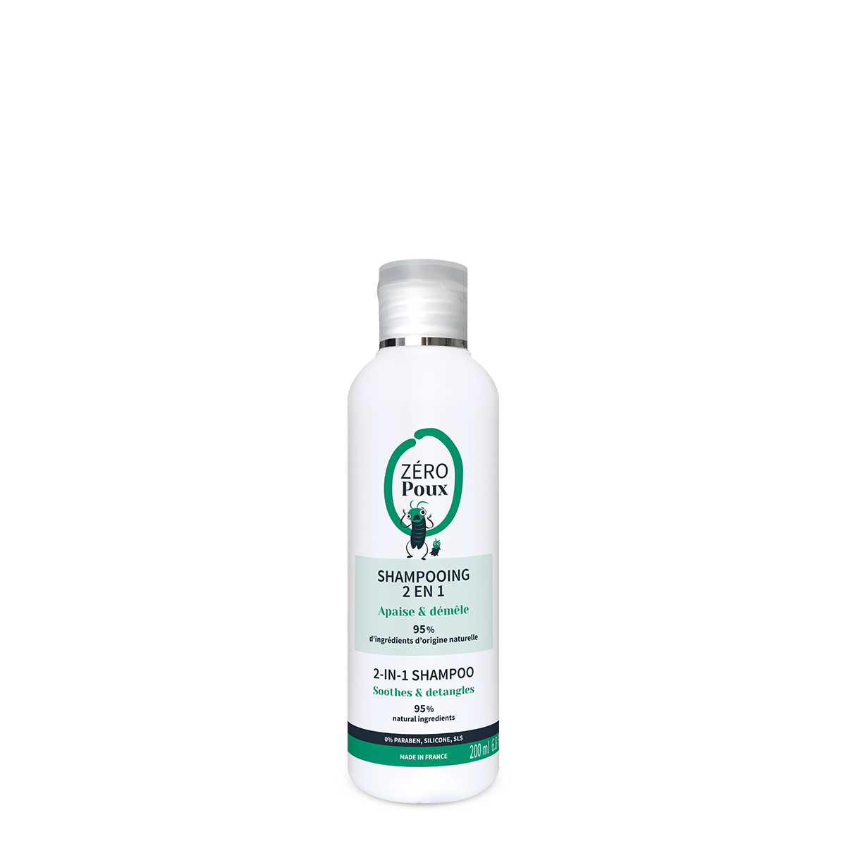Le Shampooing 2-en-1 Zéro Poux va venir nettoyer le cheveu en profondeur tout en facilitant le décollage des poux et des lentes. Respecte le cuir chevelu des enfants. Facilite le démêlage. 95% d'ingrédients d'origine naturelle. Sans parabène, sans silicone, sans SLS, sans MIT/MCIT. Flacon 100% recyclable. Fabriqué en France. Vegan certifié. Clients témoignent efficacité parfum agréable, plus an utilisation fille maternelle, pas problèmes poux, sent réellement très bon.